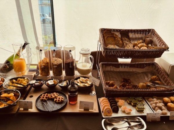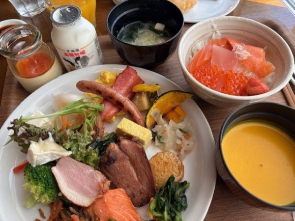 ビュッフェコーナー、大満足のラインナップです!北海道らしい、秋らしい♪ いくら入り海鮮丼、いろんなチーズ、新鮮地元野菜にかぼちゃのポタージュ、高橋牧場の飲むヨーグルトetc.この後もデザート!と盛り盛り!!!食べすぎ要注意!ですが、朝からどれもおいしくて食べらさる!!