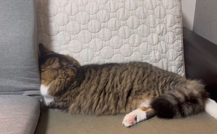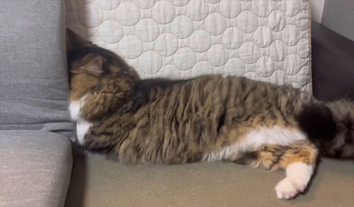 顔を隠すように埋ずめているのは、愛猫の『ほたて』くん。 なんでも、ママさんがいなくて拗ねてしまっているそうです。