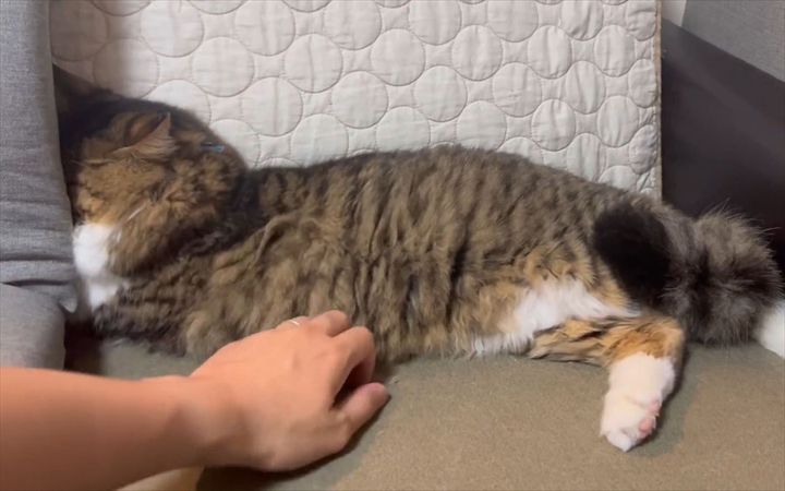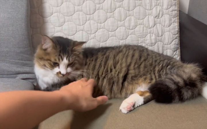 すっかり拗ねているネコ。 飼い主さんがトントンと体を優しくたたくのですが・・・、反応は芳しくありませんでした。