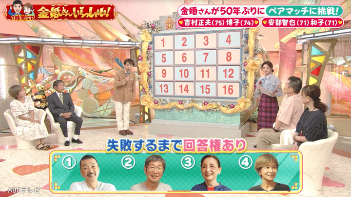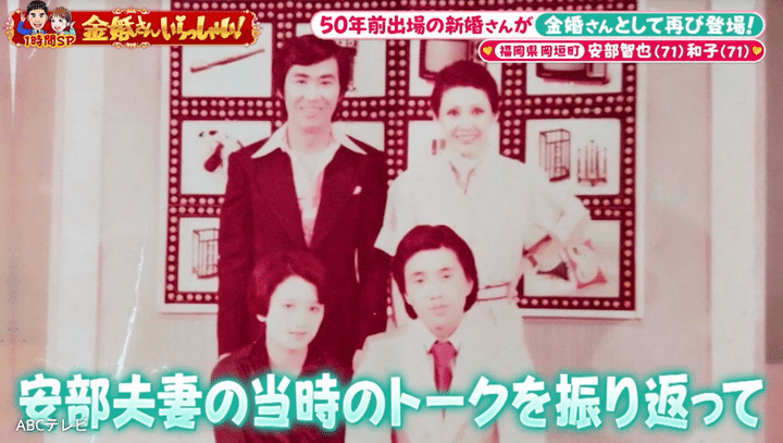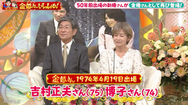 1組目の金婚さんは、1976年6月出場のご夫婦。福岡県岡垣町にお住まいで、朝ラジオ体操が日課の、共に元気な71歳だ。結婚して50年の現在、子ども2人、孫5人、そして今年8月に誕生したひ孫を含め13人の大家族となった。