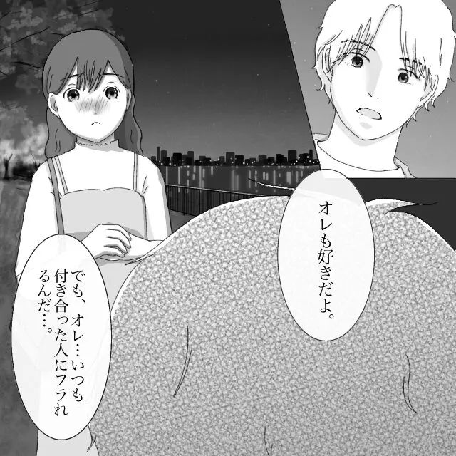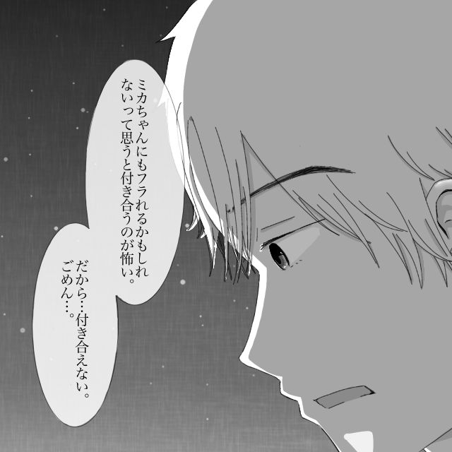 インカレサークルで、コミュ力が高く、周りへの気遣いもできるレンさんと出会ったミカさん。はじめは頻繁にくる連絡に戸惑っていましたが、レンさんの優しい言葉と気遣いに徐々に惹かれていき、知り合ってしばらくが経った頃、思い切ってレンさんに告白しました。一瞬驚いた表情を見せるレンさん。「オレも好きだよ」とミカさんの欲しかった返事をくれましたが、「でもオレ、いつも付き合った人にフラれるんだ・・・ミカちゃんにもフラれるかもしれないって思うと付き合うのが怖い、だから付き合えない」と悲しそうに言いました。ミカさんは「私は今までの彼女と違うよ?」と伝えますが、レンさんの気持ちは変わりません。「付き合えなくても、今と変わらず仲良くしてくれる?」と言うレンさんに、「うん・・・これからもよろしくね」とフラれたショックを隠すように笑って返事をしました。