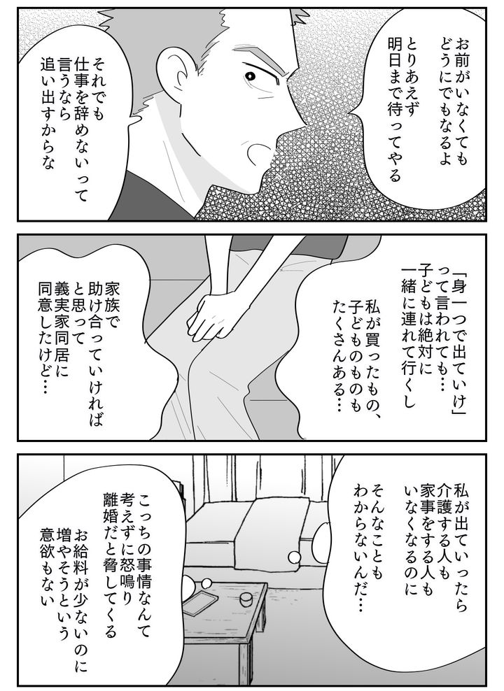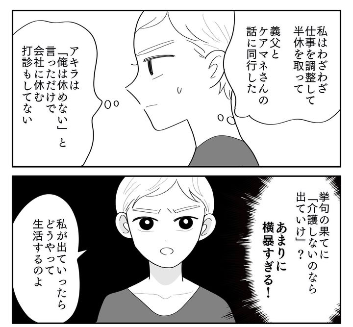 私は会社員のアカリ(35歳)。夫のアキラ(40歳)と結婚して息子(7歳)と娘(5歳)がいます。3年ほど前、私たちは義実家での同居をはじめました。しかし夫はそれ以来、私に対して威圧的な態度を取るようになったのです。今日は義父のケアマネジャーさんへの相談に同行し、認知症がすすんだ義母の施設入居を検討することになりました。それを聞いて激怒した夫は、私が仕事を辞めて自宅で介護をしないのなら、「離婚だ!」と怒鳴ってきたのです。