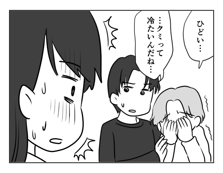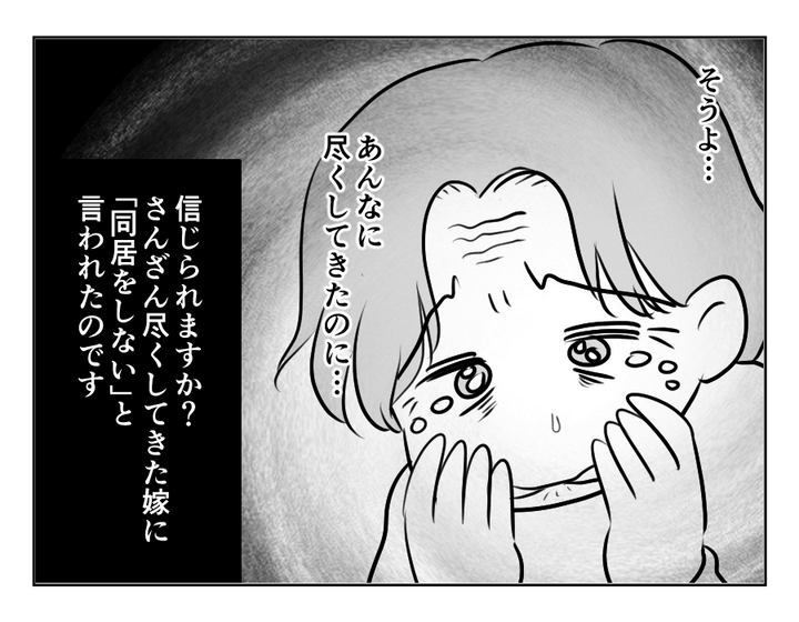 お義母さんは「いろいろクミさんに尽くしてきた」と言っています。だからこそ同居をお願いしたのに、クミさんは同居を拒否しているようですね。マサヨシさんまで「クミは冷たい」と、クミさんを責めている様子。クミさんは驚いた顔をしていますが……。どうしてこんなことになってしまったのでしょうか。