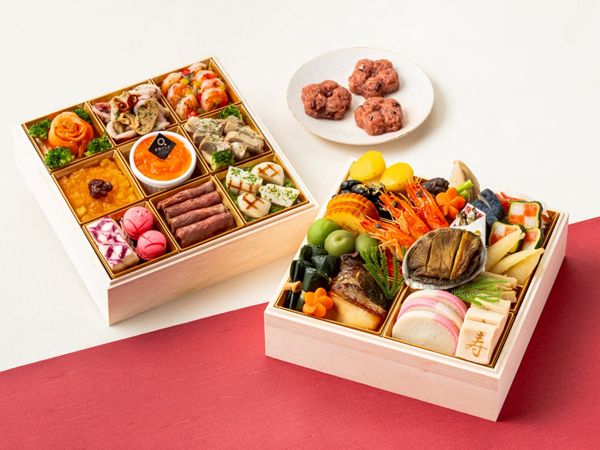 「和歌山名産 金山寺味噌使用 ブリの味噌漬け焼き」「和歌山産干し柿入り 柿なます」「筍の旨煮 和歌山産ぶどう山椒風味」「スモークサーモンのローズ仕立て 野菜入りサワークリーム 和歌山産じゃばらジャム添え」などこだわりの食材を使用した唯一無二のラインナップとともに、別添えの「梅型ミニお赤飯」も見逃せません。