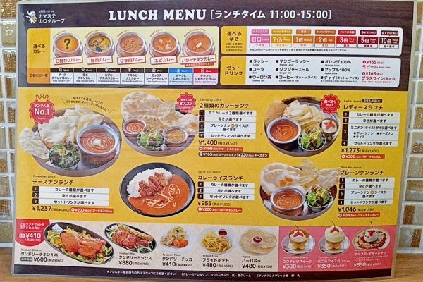 1. カレーの種類が選べます → 日替わり(ポークとしめじ) 2. 辛さが選べます → 普通(1倍 中辛) 3. ミニナン(ライス) が1つ選べます → チーズナン 4. セットドリンクが選べます → マンゴーラッシー