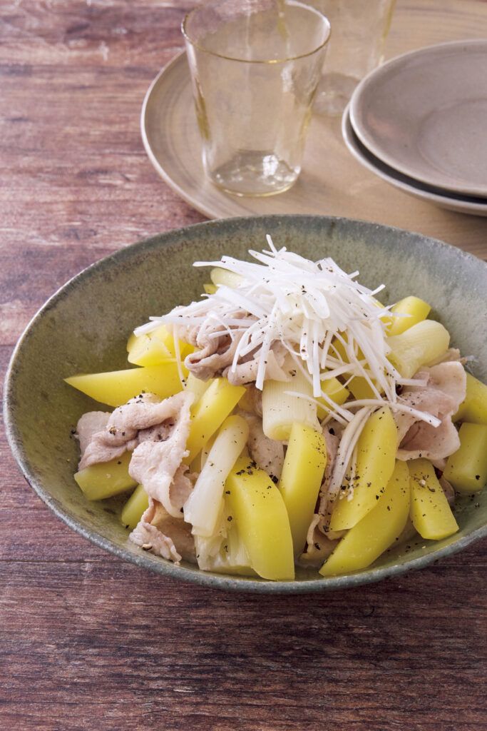 フライパンに〈A〉を入れて混ぜ、じゃがいも、ねぎと取り出したねぎのしんを入れて中火で煮立て、落としぶた※をして5分ほど煮る。さっと混ぜ、豚肉を広げながらのせ、再び落としぶたをして3分ほど煮る。さっと混ぜて器に盛り、せん切りにしたねぎをのせて粗びき黒こしょう少々をふる。