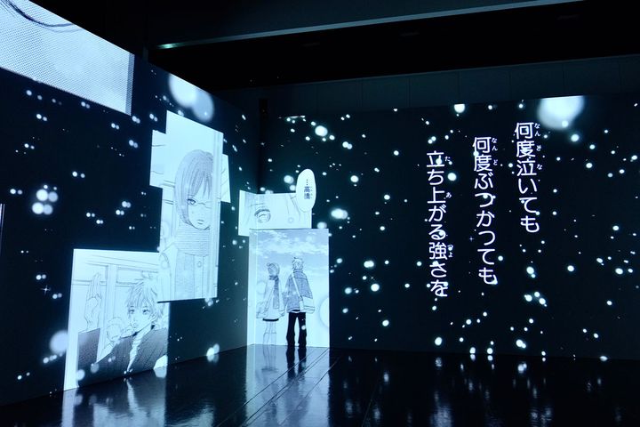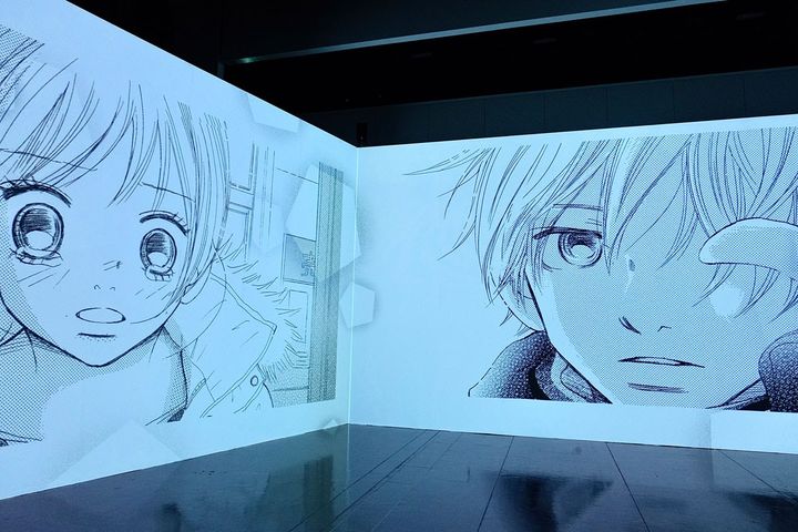 次のエリアでは、約35分の「イマーシブ映像」を体験することができます。20世紀を代表する往年の名作から、『僕等がいた』や『砂時計』など、アラサー女子の青春を彩ってくれた王道の青春漫画、『主人恋日記』や『柚木さんちの四兄弟。』など、令和のベツコミを盛り上げている作品など、計16作品が登場します。