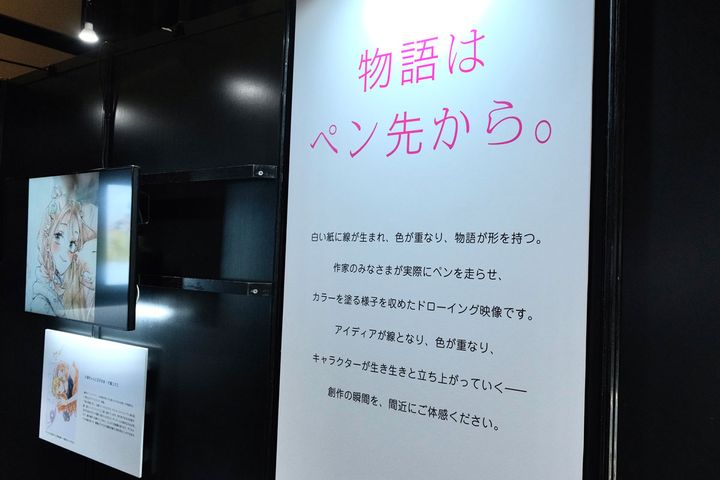 こちらは作画風景をタイムラプス映像化した「ドローイング映像」のコーナー。作家さんの制作現場で、下書きにペンが入り、色やトーンが載っていく様子は、なかなか見ることができない貴重な映像。大好きな作品たちは、漫画家さんたちの手によって大切に息が吹き込まれてきたことを実感できます。ドローイング映像に添えられた紹介コメントも必見です。