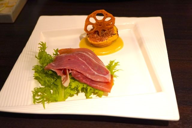 夕食は「土地の恵み会席」。美しく盛られた前菜からはじまり、鯛や烏賊のお造りなどが順番に運ばれてきます。