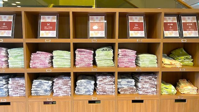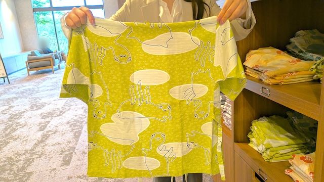 子ども用の甚兵衛もありました。描かれているのは亀の井ホテルのオリジナルキャラクター「ふにゃらん」。背中に温泉マークがある亀の妖精です。このゆるさ、たまらなく可愛い!