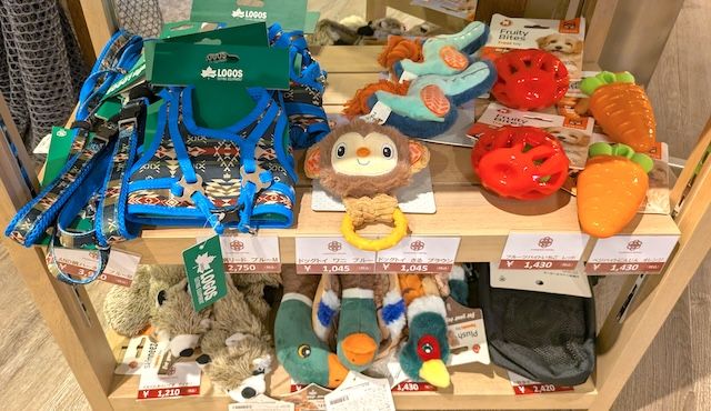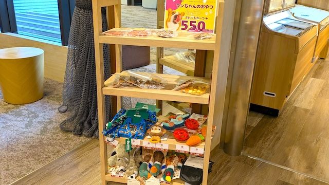 気になるワンちゃんコーナーを覗いてみると、おもちゃとハーネス、亀の井ホテル 青梅オリジナルのおやつが売っています。