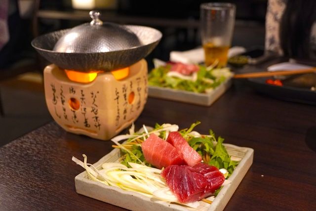 沸いた出汁にマグロを潜らせてしゃぶしゃぶのようにいただく江戸郷土料理ねぎま鍋。表面にはうっすら火が通り、中の脂がふわっと溶けてお刺身とは一味違ったおいしさです。