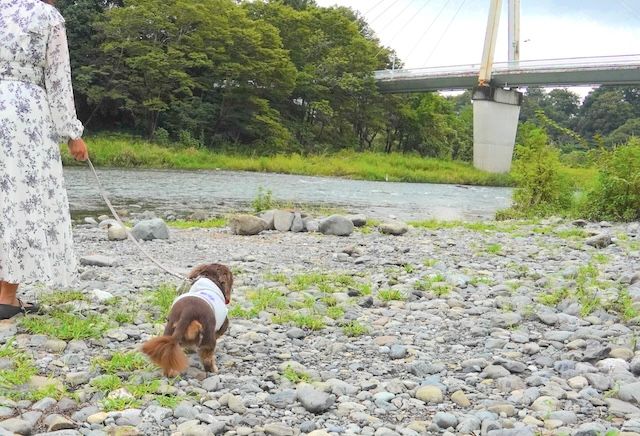 ホテルを出ると目の前にあるのが釜の淵公園。川べりはワンちゃんのお散歩にもぴったりです。夏には水遊びをする人たちも多いそう。