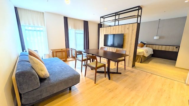 ドッグフレンドリールームは専用エリアの1階に4部屋と2階に5部屋の計9部屋。こちらは「ドライサウナ付きプレミアムフォースルーム」。モダンなインテリアがおしゃれなお部屋です。