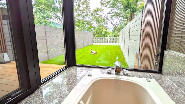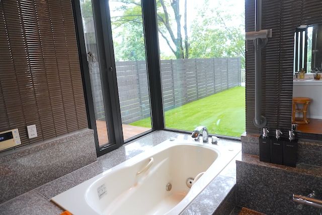 ガラス張りのバスルームからはドッグランが一望できます。ワンちゃんが遊ぶ様子を見ながらのお風呂なんて贅沢すぎる!