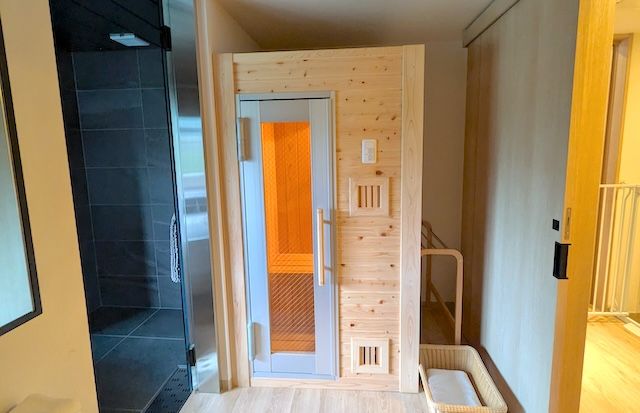 この部屋の特徴はなんといっても浴室横にあるドライサウナです。お部屋にいながらサウナが楽しめるなんてこれは至福!