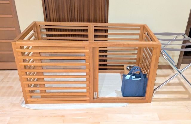 お部屋のワンちゃんグッズをチェックしてみましょう。こちらはワンちゃんのケージ。木製でおしゃれです。