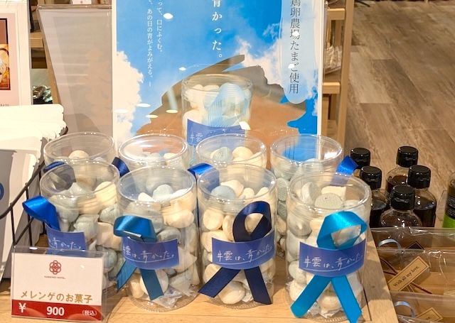 青梅にある養鶏場「かわなべ鶏卵農場」で採れたこだわり卵のメレンゲで作ったお菓子。爽やかなブルーが目を惹きます。