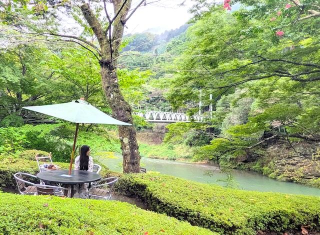 緑深い山間のテラスでは、日本酒やおつまみ、スイーツなどを楽しむことができます。園内の丸テーブルであればワンちゃんと一緒での利用が可能です。また酒造見学やきき酒処など、ワンちゃんがいない日にも楽しめそうな施設もあるので、気になる人はチェックしてみてくださいね。