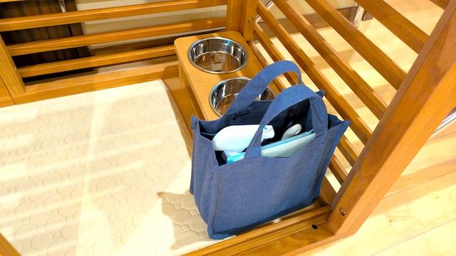 中にはお散歩バッグとワンちゃん用のお皿が準備されていました。このお部屋に部屋食プランはありません。また、ワンちゃん用の食事もついていないので自分で用意する必要があります。売店にはワンちゃん用のおやつは売られていますが、ご飯は置いていないのでご注意を。