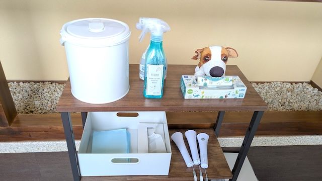 こちらはトイレ。すぐそばには空気清浄機が置かれています。トイレの横に置いてあるゴミ箱は、排泄物やペットシーツ、ワンちゃん用のオムツを捨てるためのもの。外蓋の中にさらに中蓋がついていて、匂い対策もバッチリです!