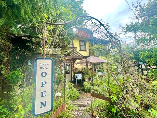 ホテルから車で5分ほどの場所にあるカフェ「アイムホーム」。植物に囲まれた外観は物語に出てきそうな雰囲気です。