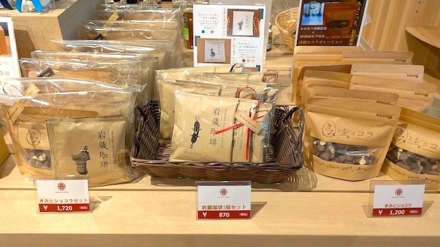 売店にはお土産がたくさん。青梅の岩蔵温泉にある岩蔵珈琲の3種類のオリジナルブレンドは、この土地の文化財や民俗行事にちなんだものだそう。