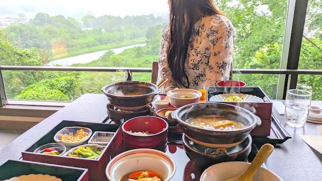 朝の食堂の窓からは多摩川がゆったりと流れる様子が望めます。豊かな緑を見ながらの食事はリラックスできる時間。