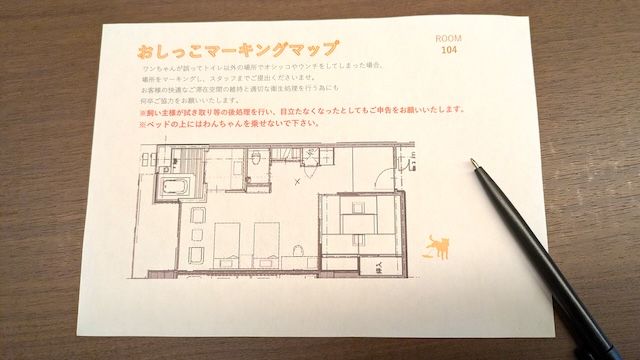 いつもと違う場所でのトイレはワンちゃんも飼い主さんもちょっと不安。もしトイレに失敗したらその場所をきれいにした上で、粗相してしまった場所をお部屋に置いてあるこちらの用紙に書いて帰りにフロントのスタッフさんに渡しましょう。