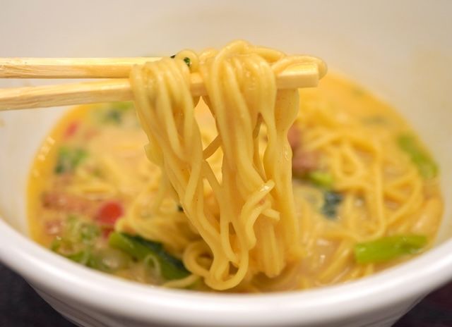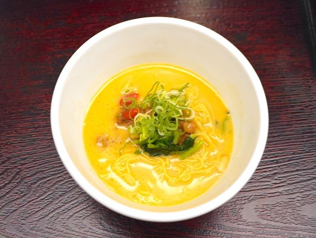 コックリした細麺によく絡むのは、まろやかながらも少しだけピリッとした刺激を感じるスープ。1人前の半分の量もこの時間にはちょうどいいボリュームです。