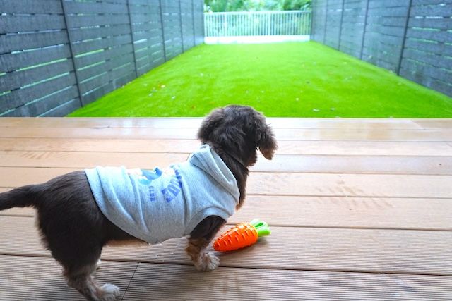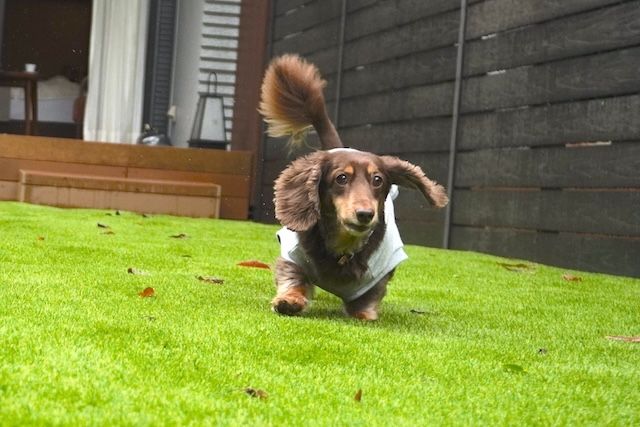 今回の滞在で一番楽しみにしていたのが、部屋についた専用ドッグラン。人工芝が敷かれたスペースは、ミニチュアダックスが1匹で独り占めするには広すぎるほどです。
