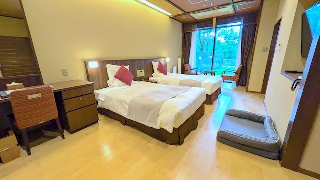 筆者が泊まったのは、1階の「プライベートドッグラン付デラックススイート(バス付)」です。和室とベッドルーム、テラスの先には専用ドッグランがあってかなり広々しています。