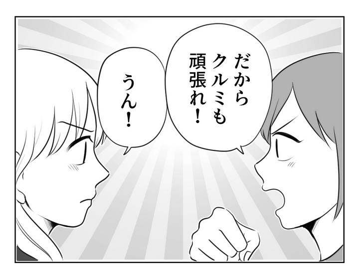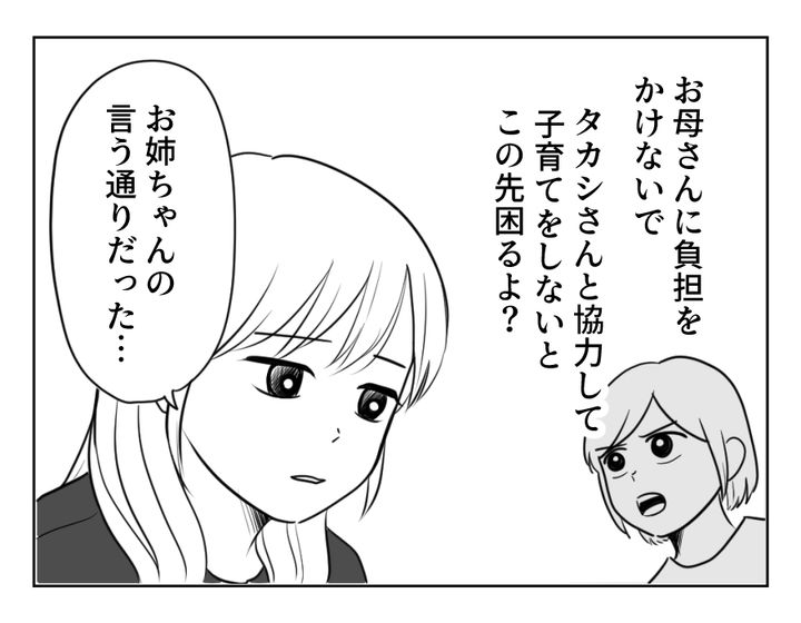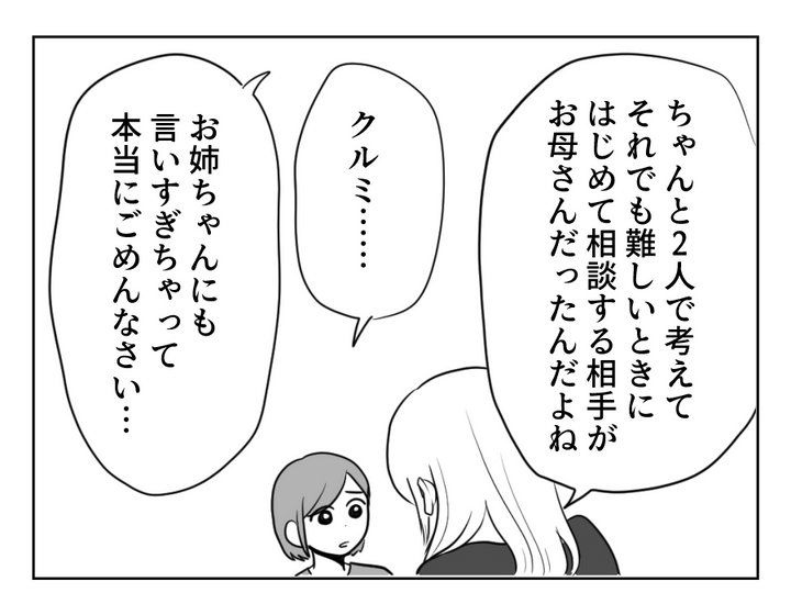 クルミさんが何だか少しだけ大人になったように見えますね! 誰かを頼る前提の子育ては、必ず行き詰るときが来ます。「今がよければいい」という考えは、「今」しか見えていない危険性もはらんでいるのです。子育ては続くし、家族としての生活も続いていくのです。その継続の中の「今」であることをしっかり自覚して、長い目で見て「今」どうすることが一番いいのかを考えられるといいですね。