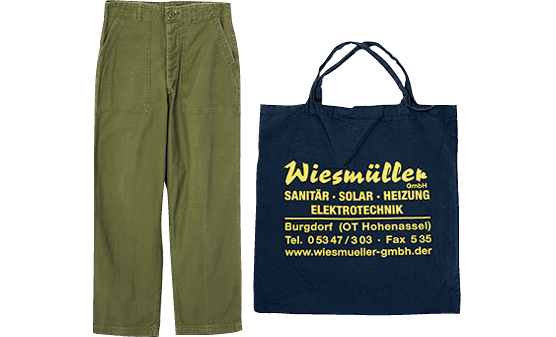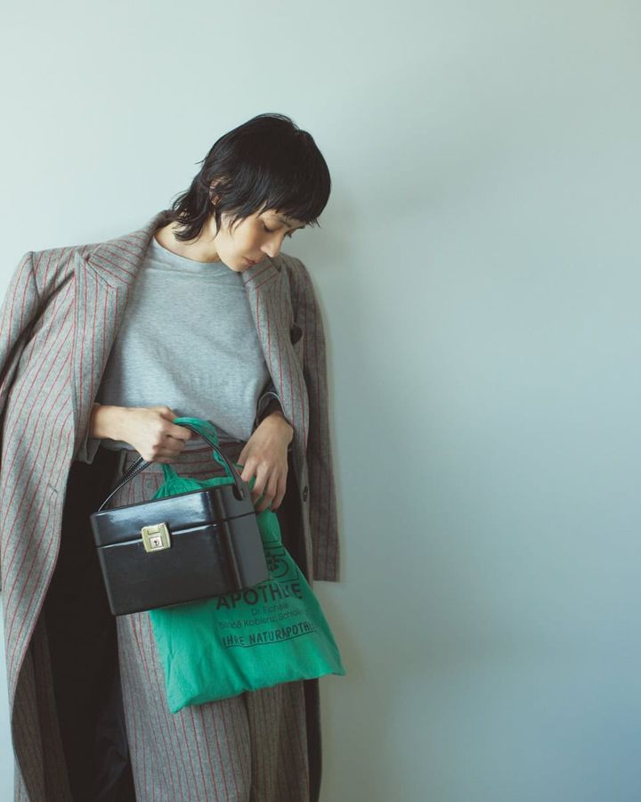 ★バッグ¥8,690(アンバーヴィンテージ)、★トートバッグ¥2,530(サンタモニカ 原宿店)、コート¥279,070、パンツ¥120,285(共にリトコフスカ/エイチ ビューティー&ユース)、中に着たロングTシャツ¥20,900(SEA/エスストア)