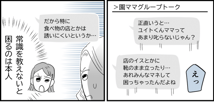 私はミスズ(32)。とある地方でユイト(3)と夫の3人で暮らしています。私の子育てのモットーは「のびのび」! 大人のルールを押し付けず、子どもには子どもらしく成長してほしいと願っています。今日は友人のユカと久しぶりにランチに来ています。ユイトは退屈なのか、靴のままソファにのったり、うしろの席の人に話しかけたりしています。私は別にこのくらいのことで怒らないのですが……そのことでユカに文句を言われてしまいました。