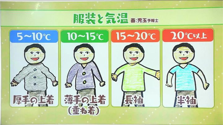 あくまで目安ですが、20度に届かなくなると長袖、15度以下は薄手の上着など重ね着が必要。10度以下になると厚手の上着が欲しくなります。