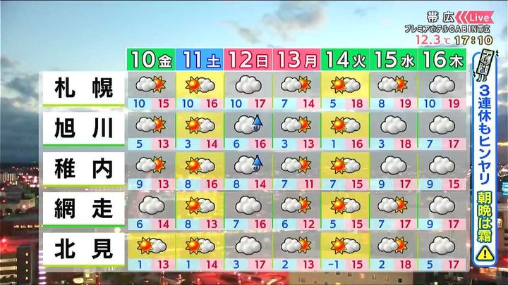 晴れる日が多いですが、連休中日の日曜は道南方面で雨が降るでしょう。晴れる日の朝晩は冷えて、霜がおりる寒さになります。日中も長袖が必要です。