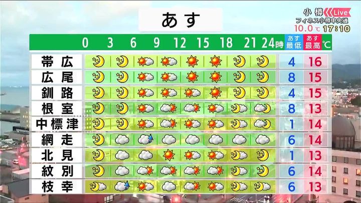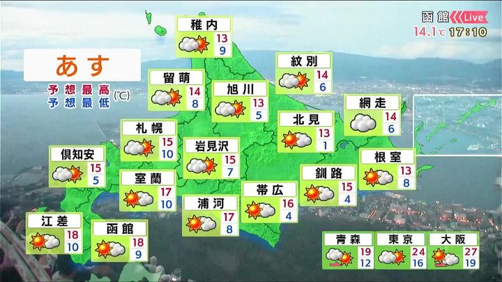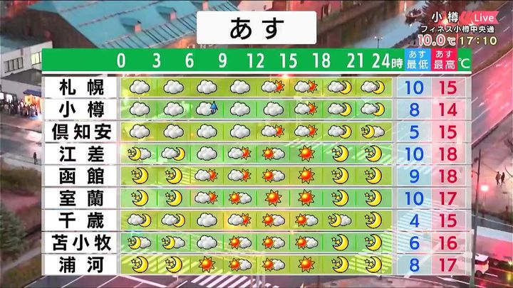 朝まで小樽で雨が降り、札幌でもにわか雨の可能性があります。函館や浦河は晴れるでしょう。北風が少し強まり、空気はヒンヤリします。