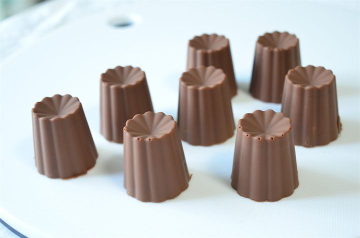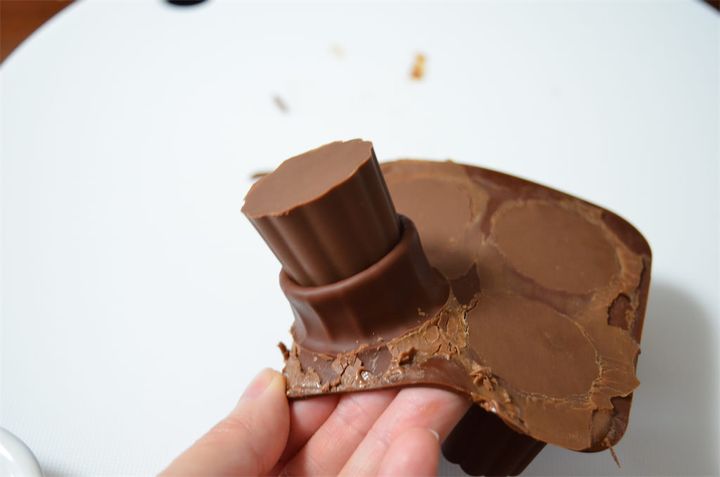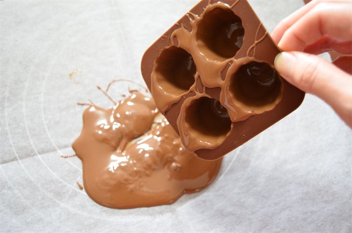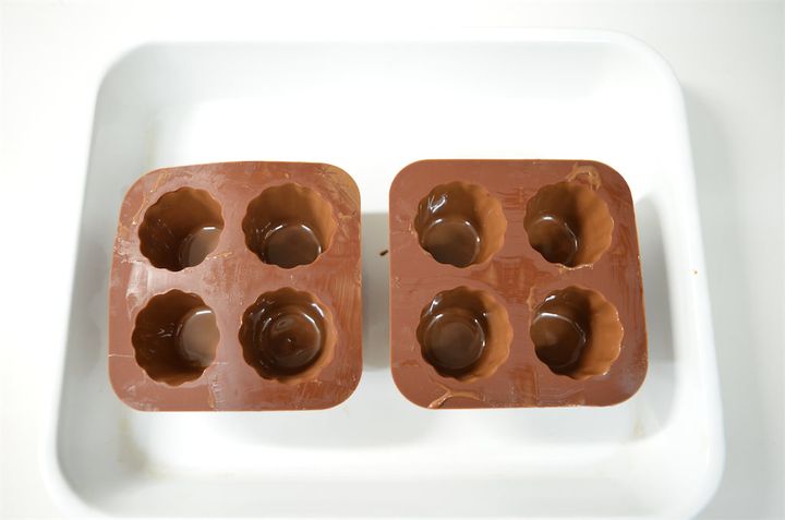 2.  湯せんで溶かしたダース(ミルク)を型にたっぷり流し込み、型の内側にチョコレートがついたらひっくり返して、余分なチョコレートを落とし、30分~1時間ほど冷蔵庫で冷やす。