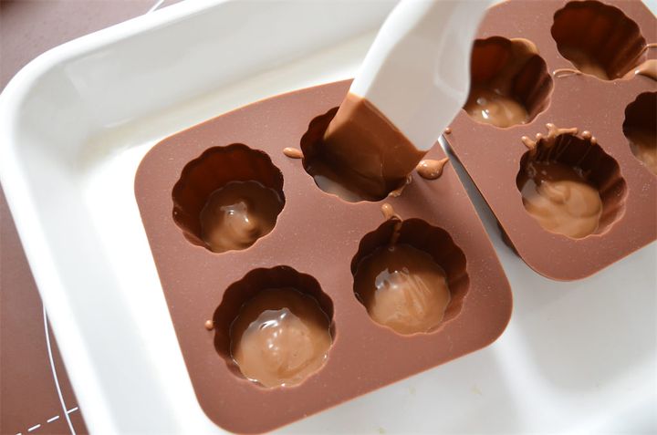 4. 最後に2で残ったチョコレートを再度湯せんして溶かし、型に入れる。その上にクッキングシートでフタをしたら、余分なチョコレートを落とす。