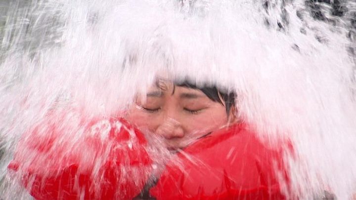 男性も女性も容赦なく冷たい水を浴びせられます。