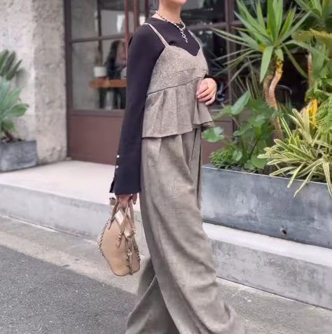 シックで洗練された大人のワントーンコーデ。グレーワントーンで上下をまとめ、黒のインナーやメガネで知的なシャープさを加えています。メローフリルやレイヤードデザインが施されたトップスは、一枚で表情豊かな奥行きを生み出しています。それに対し、ボトムスはルーズなシルエットでリラックス感を演出。全体的にやさしいグレートーンで統一されていながらも、異なる素材感の組み合わせによって、シンプル以上の奥ゆかしいおしゃれが実現しています。