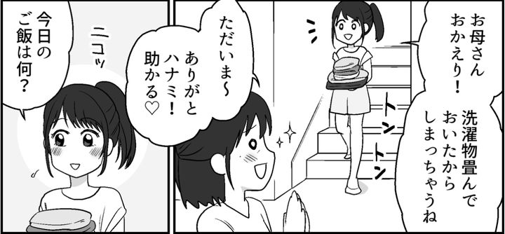 ハナミの手には畳まれたタオルがありました。乾いた洗濯物を片付けてくれていたのでしょう。最近はハナミも積極的に家事を分担してくれて、ありがたいかぎりです。しかし2階のトオルの部屋からは、誰かと大声で笑ったり騒いだりする声が……。