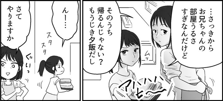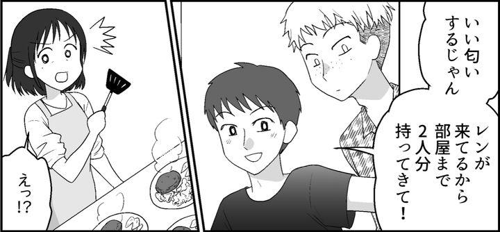 階段を下りてくる音が聞こえて、トオルとその友だちが現れました。はじめて見る顔で、レンくんというようです。するとトオルが思いがけないことを言いました。「部屋まで夕飯2人分、持ってきて」私はその言葉に驚いて手を止めました。