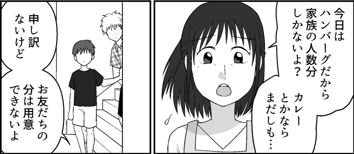 それなのに今日は、まさか友だちに食事を出せと言ってくるなんて……。そんなこといきなり言われても、レンくんの分なんてありません。今日のメニューはハンバーグ。きっちり家族の人数分しか用意していないのに、来客者の分まで出せるわけがありません。