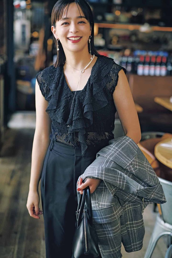 レースボディスーツ¥20,900(プランクプロジェクト/プランクプロジェクト 青山店)ジャケット¥61,600(バウム・ウンド・ヘルガーデン/エスアンドティ)バンドゥ¥4,400(ミラ オーウェン/ミラ オーウェン ルミネ新宿2店)パンツ¥49,500(エステータ/オンワード樫山 お客様相談室)バッグ¥60,500(メゾンヴァジック/ヴァジックジャパン)パンプス¥46,200(ピッピシック/ベイジュ)ピアス¥15,400(ジュスティーヌ クランケ/ザ・ウォール ショールーム)ネックレス¥46,200(リューク)