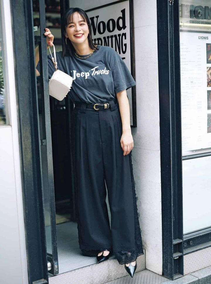 細かなディテールで華やかにキマる「レースパンツ×ロゴT」