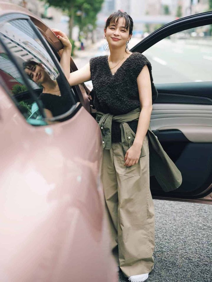 華やかさと癒しで無条件に好きなふわもこトップスで長時間のドライブもご自愛を。ほっこり感を払拭するシャープなVカット。ボーイズライクなワイドチノパンでラフに纏めて。