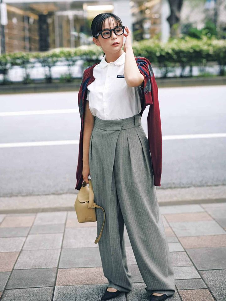 「フリル襟付きシャツ×ワイドパンツ」で可愛げ正統スタイルに
