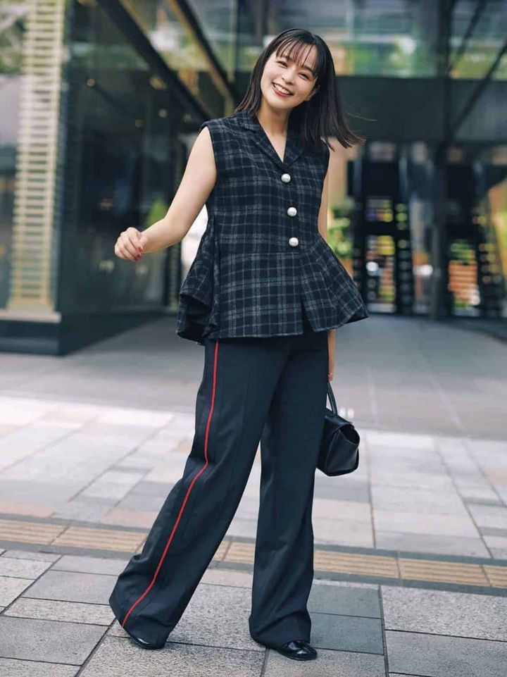 凛とした開衿とビッグパールボタン、大柄チェックなど、全方位着映えるペプラムシルエットのジレ。パキッとした赤の極細ラインが入った太パンツでコーデにスパイスを。
